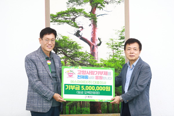 울진군은 지난 6일, 울진읍 대흥리 출신으로 자동차 프레스 및 금형제조 사업을 하는 에스아이티(주) 전제중 대표가 울진군을 방문하여, 고향사랑기부금 최고 한도액인 500만원을 기탁했다고 밝혔다.