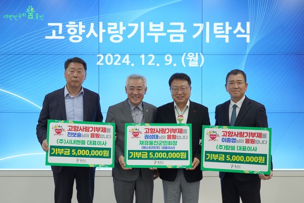 울진군(군수 손병복)은 지난 9일, 권성태 재경울진군민회장 등 3명의 지역 출향인이 고향사랑 연간 기부 최고액인 500만원을 각각 기탁하며 고액 기부가 잇따르고 있다고 밝혔다.