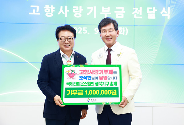 울진군(군수 손병복)은 지난 9월 9일 국제라이온스협회 경북지구 조석현 총재((주)한여울 대표)로부터 고향사랑기부금 100만원을 기부받았다.