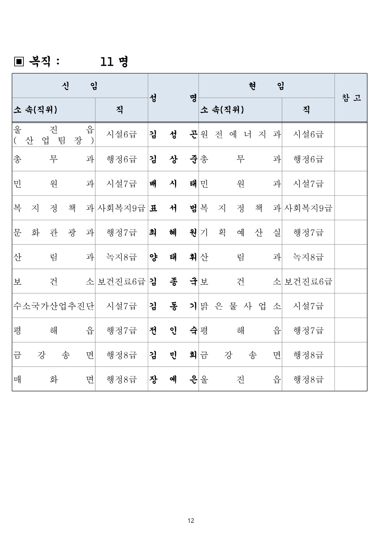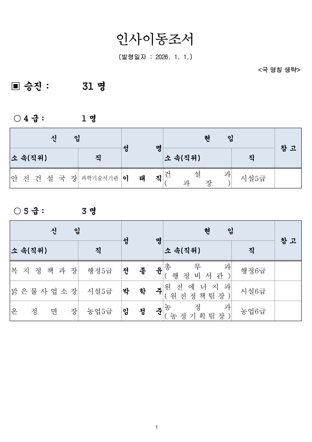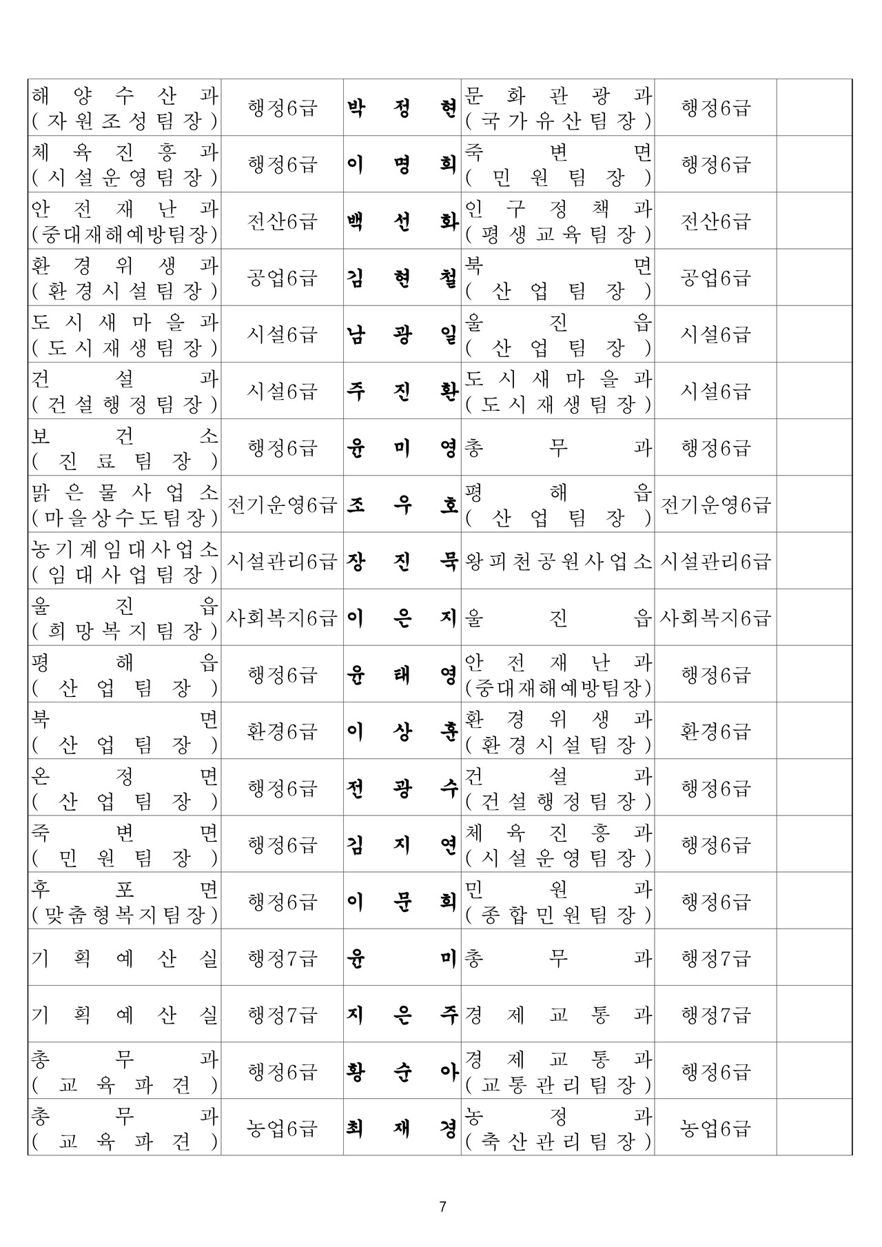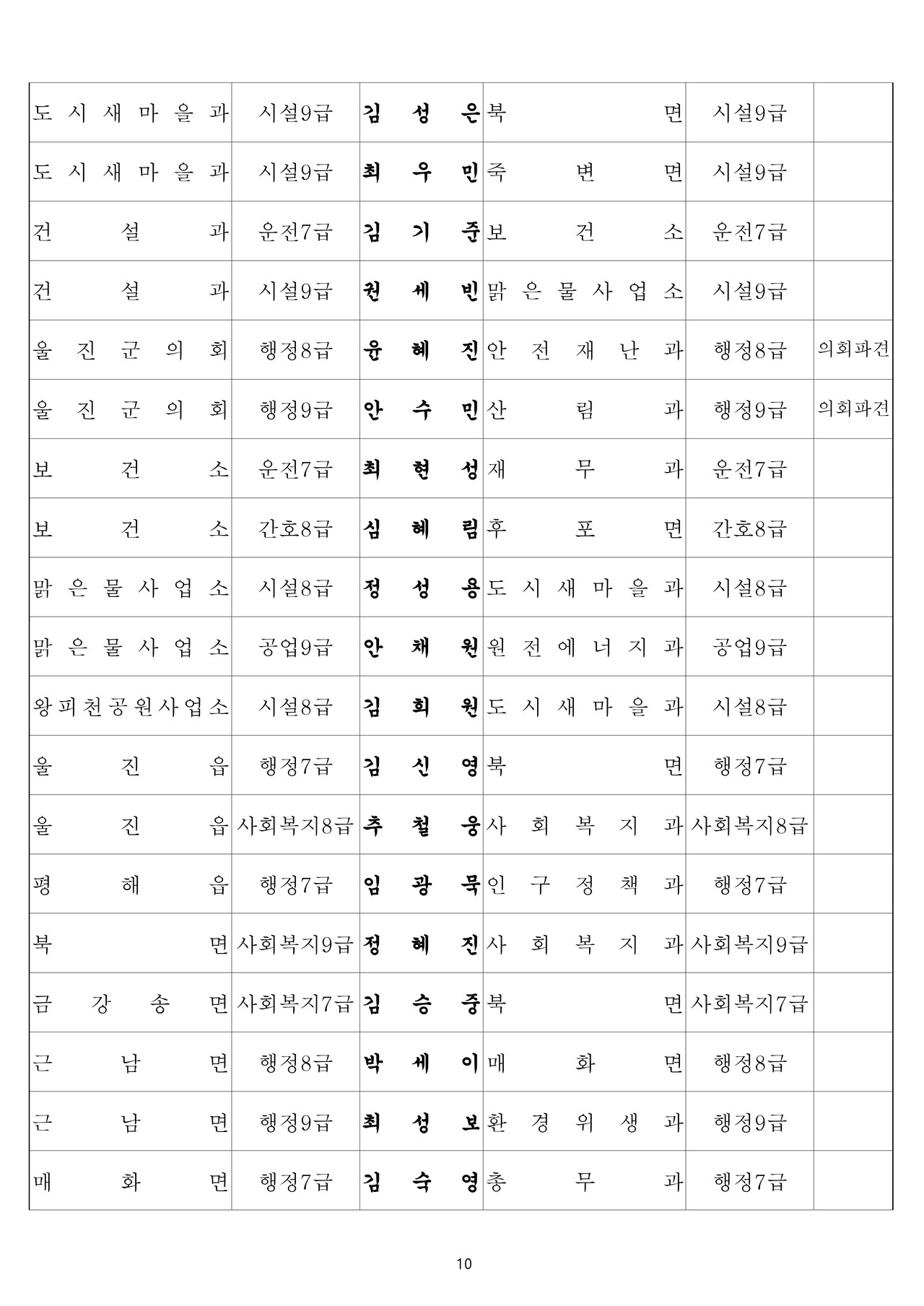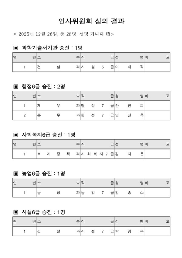 이전 기사보기 다음 기사보기 전종윤 박학주 임정준, 5급 과장 승진 바로가기 복사하기 본문 글씨 줄이기 본문 글씨 키우기 스크롤 이동 상태바 현재위치 홈 울진군 행정 전종윤 박학주 임정준, 5급 과장 승진 기자명 울진신문 입력 2025.12.29 17:13 댓글 0 바로가기 복사하기 본문 글씨 줄이기 본문 글씨 키우기 26일자 인사위원회 심의결과 울진군 승진 31명 등 대인사 인사위원회 심의결과 /편집부 울진신문 webmaster@uljinnews.co.kr 다른기사 보기 저작권자 © 울진신문 무단전재 및 재배포 금지 댓글삭제 삭제한 댓글은 다시 복구할 수 없습니다. 그래도 삭제하시겠습니까? 비밀번호 닫기 기사 댓글 쓰기 0 댓글 접기 댓글 내용입력 비회원 로그인 작성자 비밀번호 댓글 내용입력 댓글쓰기 계정을 선택하시면 로그인·계정인증을 통해 댓글을 남기실 수 있습니다. 회원 로그인 비회원 글쓰기 작성자 비밀번호 자동등록방지 로그인 옵션 창닫기 당신만 안 본 뉴스 스카이레일 뇌물 관련 4명 구속영장 청구 (7) 울진군수 선거 누가 당선되나? 전찬걸 황이주 군수 예비후보 등록 강한 추진력으로 판을 바꾸겠습니다! (4) 1심 재판부, "변상금 즉시 징수 필요하다" (10) 골재채취 관련 뇌물사건 오늘 검찰구형 (1) “울진형 기본소득·햇빛소득마을 추진” 스카이레일 뇌물 관련 4명 구속영장 청구 (7) 주요기사 '건강한 노인, 존경받는 어른' 비젼 제시 4월1부터, 울진카드 캐시백 → 12% 국가유공자 보훈 수당 100% 인상 군민안전보험 최대 1억원까지 보장 곳곳에 '벚꽃터널', 나들이객 유혹