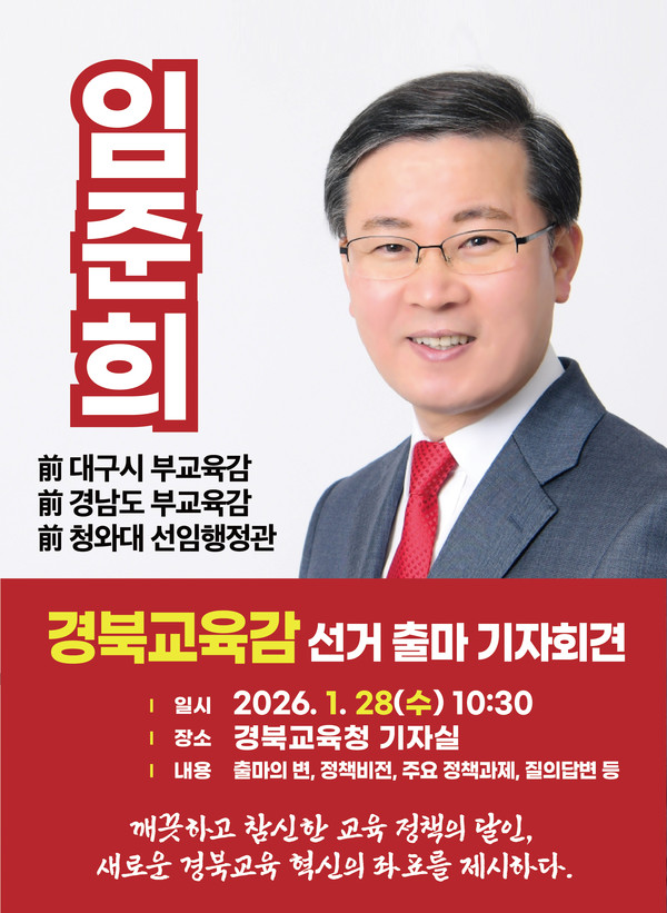 임준희 前)대구시 부교육감(前 경남도 부교육감/ 現경산시 문명고 교장)은 1월 28일 오전 10시 30분 경북교육청 브리핑실에서 기자회견을 열고, 오는 6월 3일 치러지는 경상북도교육감 선거 출마를 공식 선언한다.