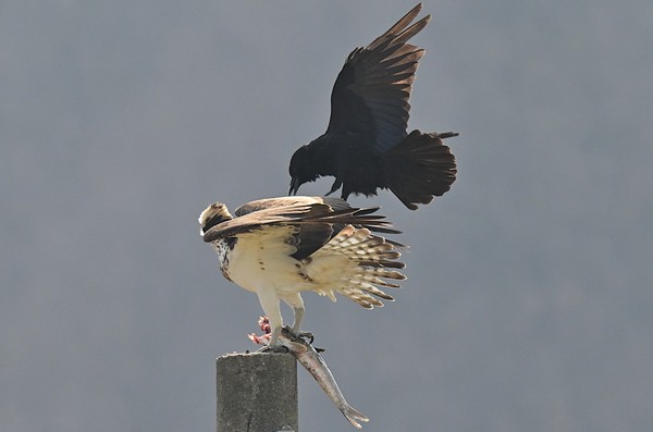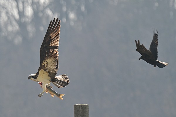 물수리의 먹이를 호시탐탐 노리는 까마귀와 까치들이 주변을 에워쌌으며, 유독 까마귀는 식사 중인 물수리 곁으로 바짝 다가가 위협을 가하며 끈질기게 먹이를 빼앗으려 드는 신경전을 벌였다.